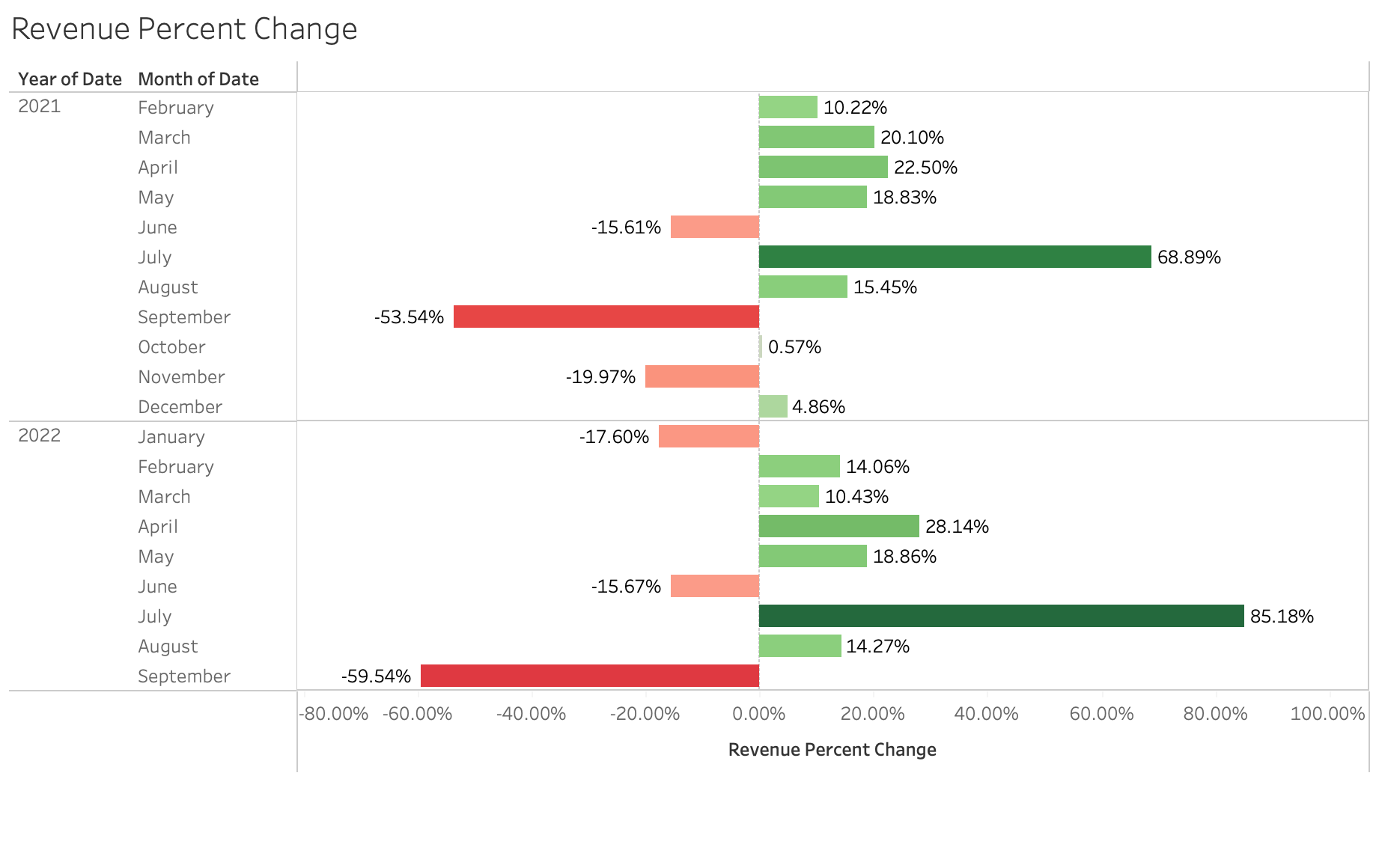| Highest Positive Change | +85.18% (Aug 2022) | Highest monthly revenue increase, indicating a strong seasonal peak. |
